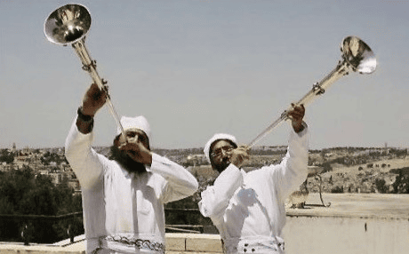 Bild 2: Ankündigung des Posaunenfestes durch den Schall der Silbertrompeten zusammen mit dem Schofar (https://templeinstitute.org - Rosh Hashana 2).