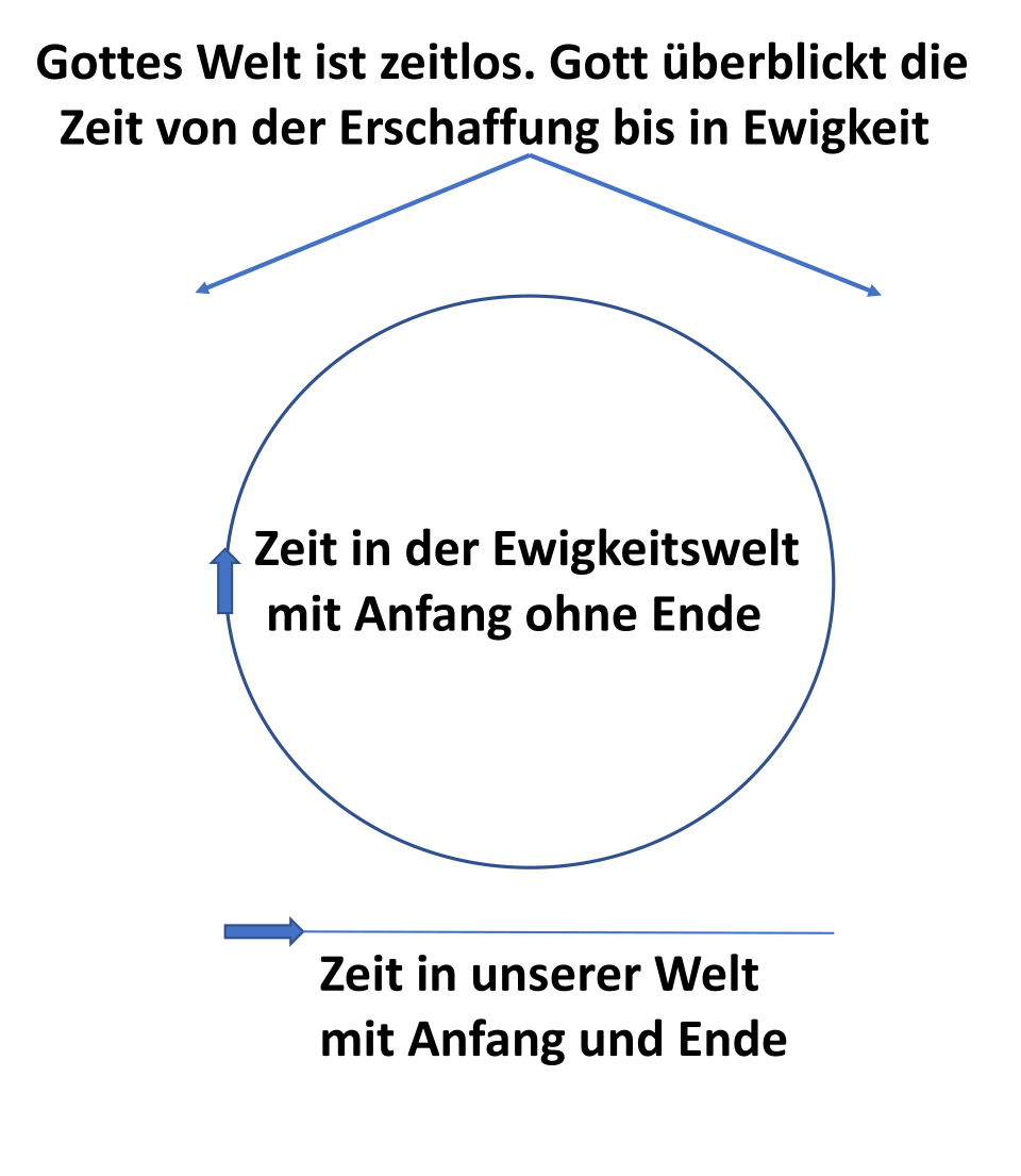 In der ewigen Welt hat die Zeit einen Anfang und kein Ende; dies ist in Abb.1 durch einen Kreis dargestellt, dessen Anfang durch einen Pfeil gekennzeichnet ist. In der zeitlichen Welt hat die Zeit sowohl Anfang als auch Ende und wird durch eine Strecke dargestellt.