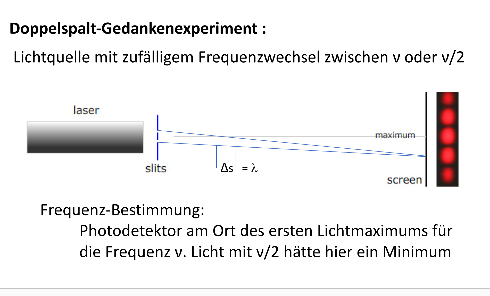 Zu diesem Zweck wird das Gedankenexperiment von Brukner und Zeilinger [20] modifiziert: Anstelle von Weg und Interferenz werden Energie und Zeit als Variablen verwendet. Analog zu ihrem Ansatz, wo die Interferenz als eine dichotomische Einheit behandelt wurde, muss die kontinuierliche Energie durch eine dichotomische Energie ersetzt werden. Dies kann erreicht werden, indem eine Lichtquelle verwendet wird, deren Frequenz stochastisch zwischen ν/2 und ν wechselt und die eine so geringe Intensität aufweist, so dass die Emission einzelner Photonen beobachtet werden kann. Für die Frequenzbestimmung wird der klassische Doppelspaltaufbau verwendet.